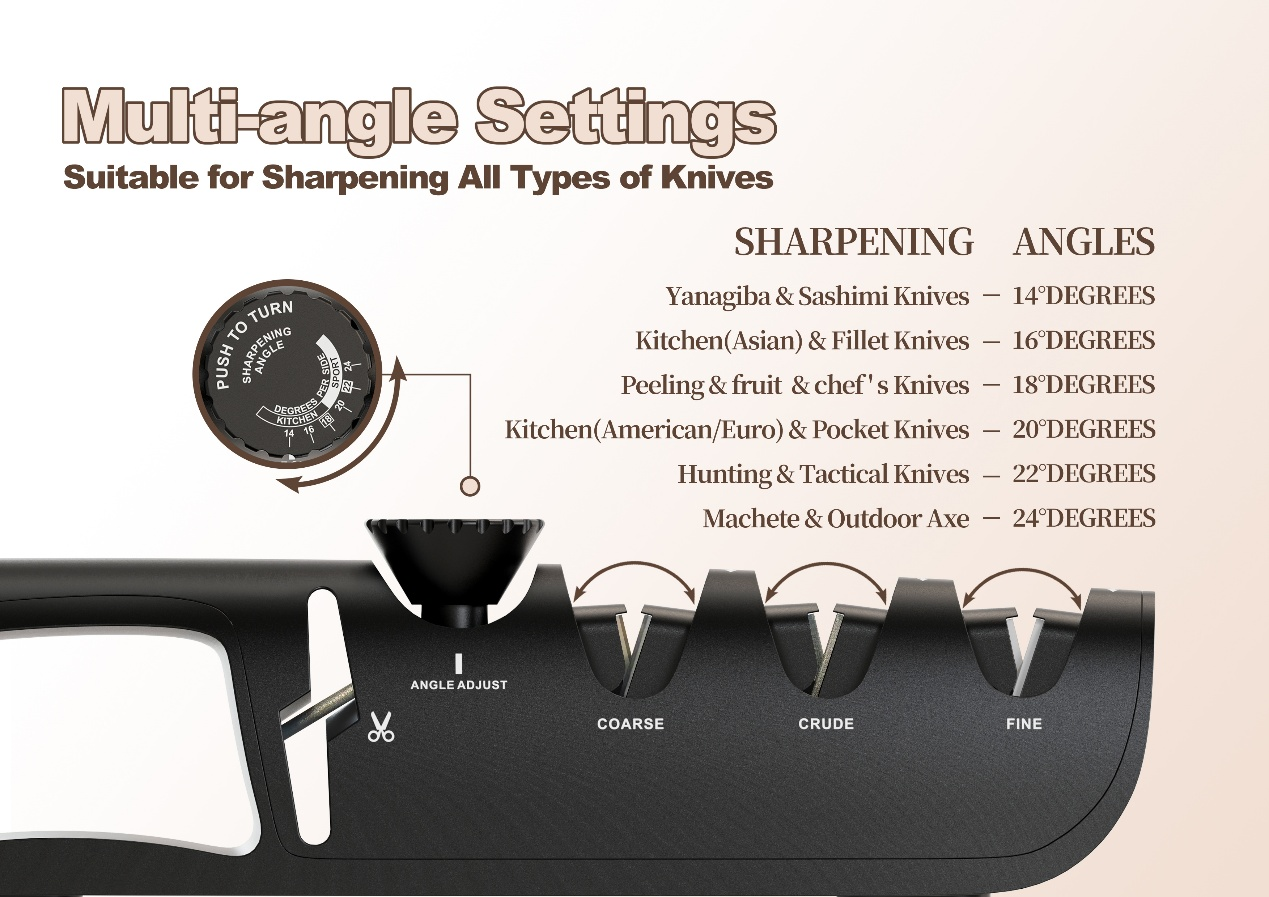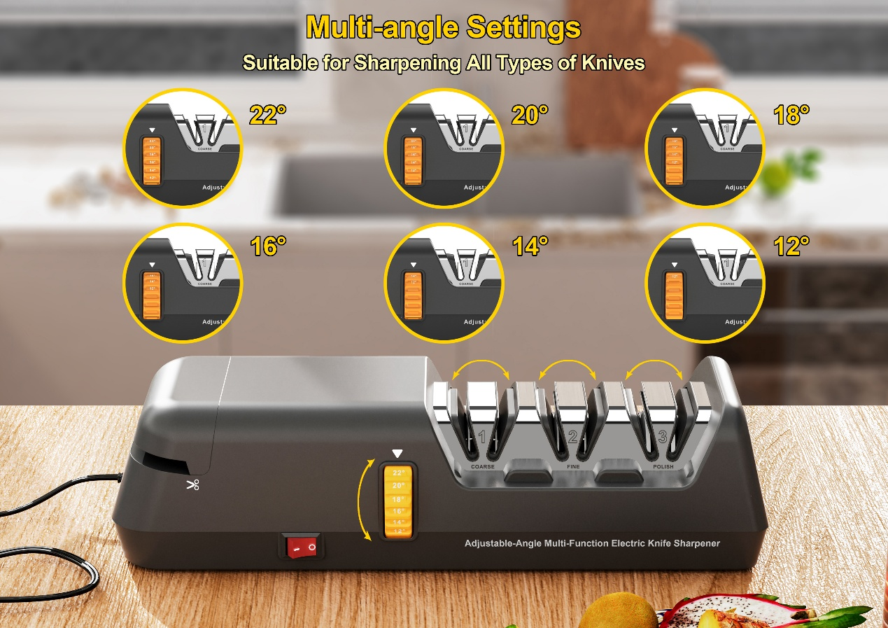 Именно в этом и заключается основное преимущество электрической точилки для ножей с регулируемым углом заточки . Регулируя ручку, пользователи могут свободно переключаться между углами заточки от 12° до 22° или даже более широкими, восстанавливая максимальную остроту высококачественных кухонных ножей, а также затачивая обычные ножи для практичного использования, создавая, по сути, «одну точилку для ножей всей семьи».